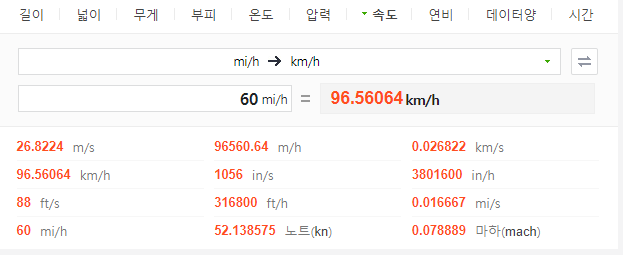 미국 영화나 드라마를 보면 시속 몇 킬로 단위는 안 씁니다. 모두 마일로 사용합니다. 미국내 차량 계기판에는 속도계 단위를 mile/h(MPH)를 사용합니다. km/h가 같이 눈금에 표기된 차량도 있습니다. 그럼 한번 바꿔 볼게요. 고속도로에서 60마일로 달리는 차량의 속도를 km/h로 변경해 볼게요.