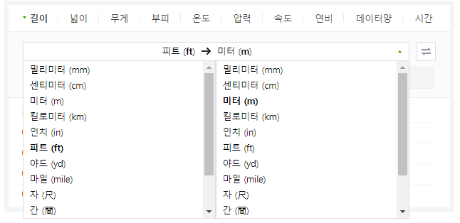 먼저, 왼쪽 단위를 피트로 선택하고 우측에 변환할 단위를 미터로 선택합니다.