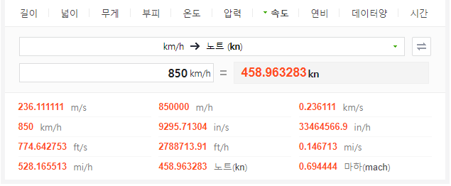850 km/h는 항해마일 속도단위로 458.96 노트가 되네요.