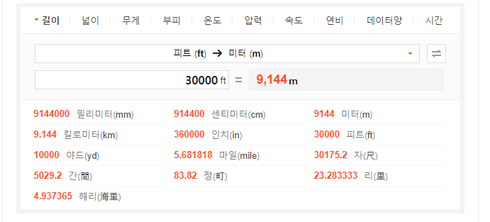 변환을 원하는 단위를 눌러서 단위변환을 해봅니다. 길이를 예를 들어 해보도록 하겠습니다. 미터법에 익숙해서 미터와 피트 간의 변환을 해보겠습니다. 우리가 비행기를 탈 때 고도 30,000 피트 상공을 순항 중입니다 라는 항공기내 방송을 들을 때 대체 얼마라는 거야?라는 의문을 가지신 적이 있겠지요. 미터로 변환해 보겠습니다.