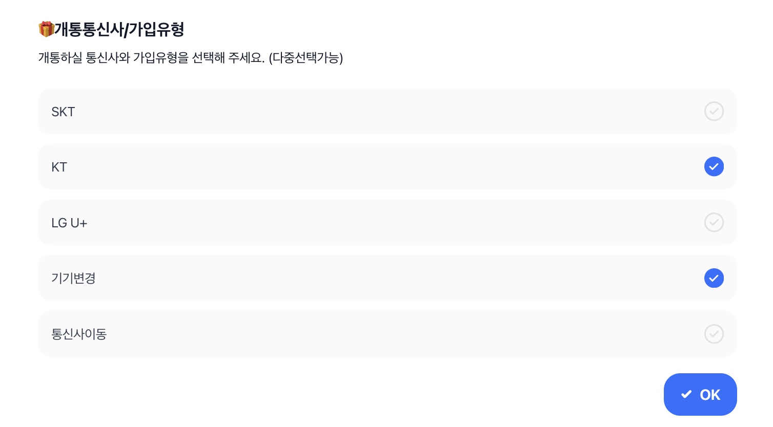 인증번호 기입이 완료되면 통신사, 가입방법(기기변경, 번호이동), 휴대폰사양, 요금제을 선택하는 화면이 나옵니다.