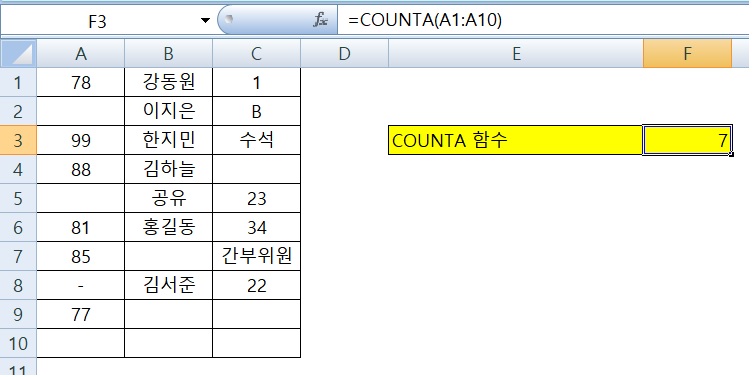 예를 들어, a1부터 a10까지의 범위에서 비어 있지 않은 셀의 수를 계산하려면 다음을 사용합니다.
