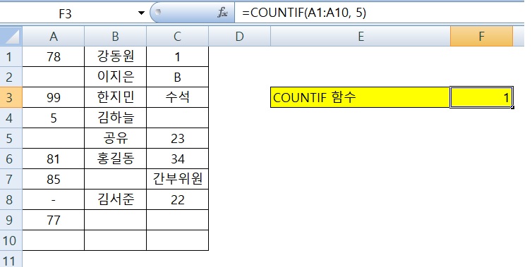 -> 예를 들어 a1부터 a10까지의 범위에서 숫자 5가 포함된 셀 수를 계산하려면 다음과 같이 서식을 작성합니다.