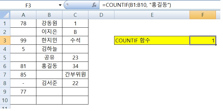 -> b1부터 b10까지의 범위에서 "홍길동"이라는 텍스트가 포함된 셀의 개수를 계산하려는 경우는