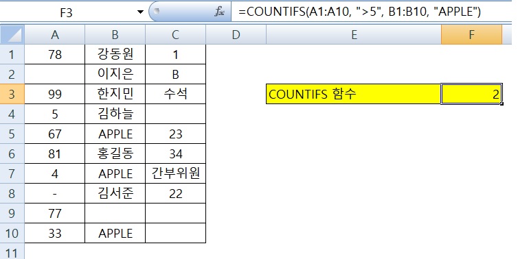 예를 들어, a1부터 a10까지의 범위에서 5보다 큰 셀과 "apple"을 포함하는 b1부터 b10 범위의 해당 셀 수를 계산하려면 다음을 사용합니다. (두 기준을 모두 만족하는 셀 수)