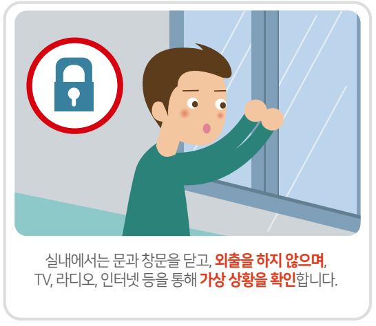 실내에서는 문과 창문을 닫고, 외출을 하지 않으며, TV, 라디오, 인터넷등을 통하여 기상상황을 확인합니다.