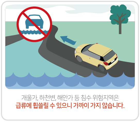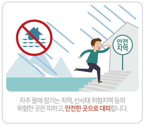 거주지역이나 현재 위치한 장소가 자주 물에 잠기는 지역, 산사태 위험지역 등의 위험한 곳일 경우 최대한 신속히 안전한 곳으로 대피합니다.
