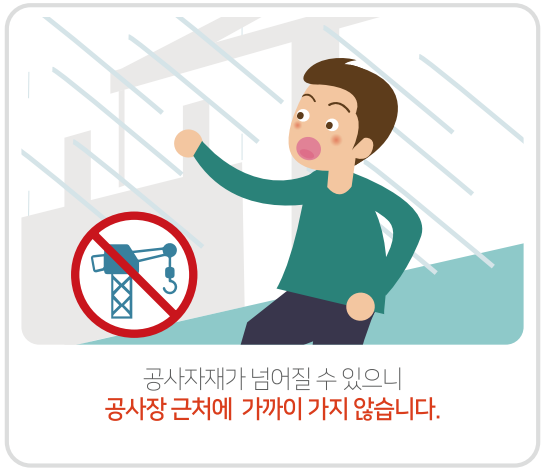 건축이나 토목공사장에는 공사자재나 장비가 호우에 넘어질 수 있으니 근처에 가까이 가지 않도록 합니다.