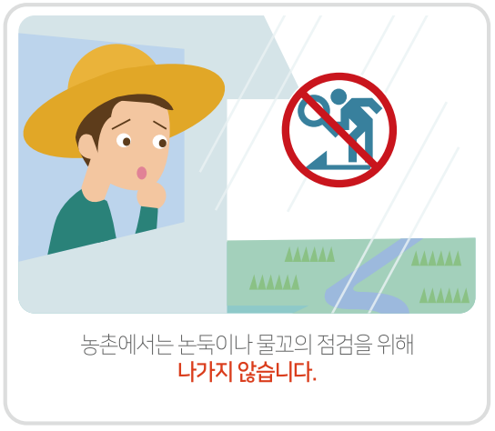 농촌에서는 논둑이나 물꼬를 점검하기 위해서 나가지 않습니다. 자칫 갑작스레 불어난 물길에 휩쓸릴 수 있습니다.