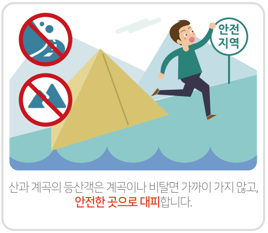 산과 계곡의 등산객은 계곡이나 비탈면 가까이 가지 않고, 안전한 곳으로 대피합니다.