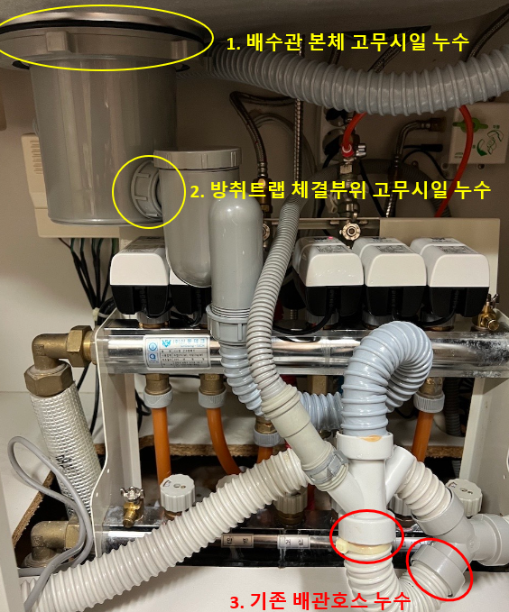 누수부위 1번의 원인은 배수구 본체 고무시일 밀착도가 떨어져서 그렇습니다.