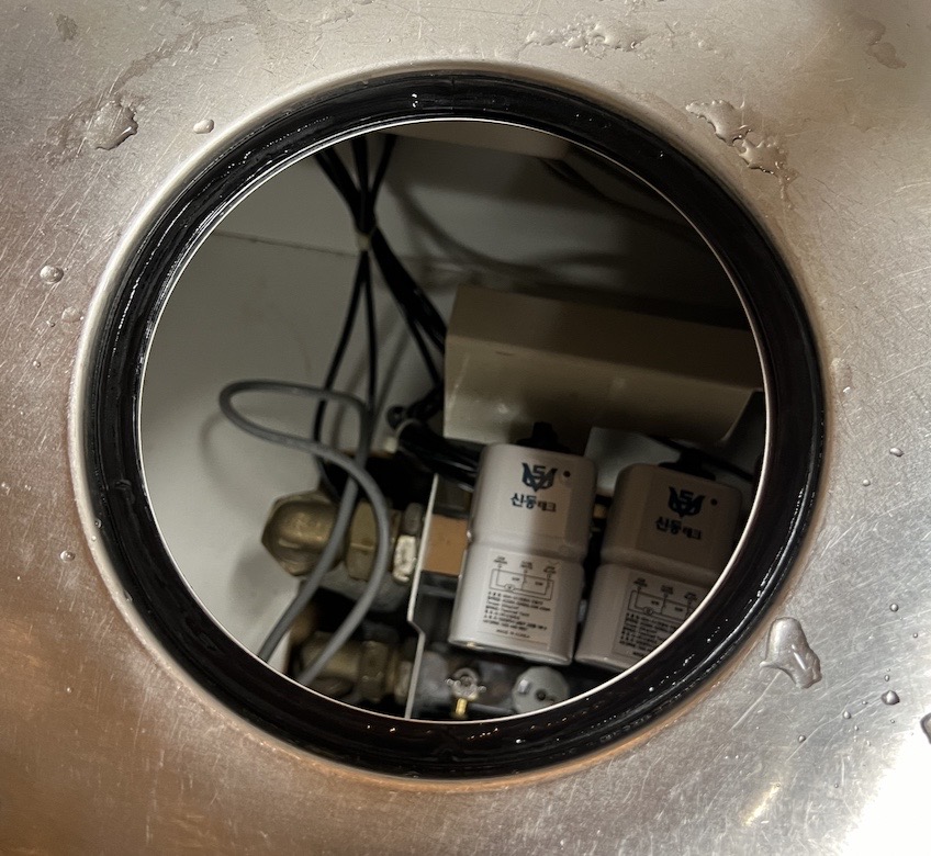 누수부위 3번의 원인은 기존 배관호스의 밀착도가 떨어져서 발생합니다. 기존 배수호스는 원래는 연질의 배관이었습니다. 그러나, 세월이 오래되어 경화가 진행되어 밀착상태가 나빠지기도 합니다. 작업 중에 힘을 주거나 해서 배관 호스가 변형이 되어서 누수가 되기도 합니다.