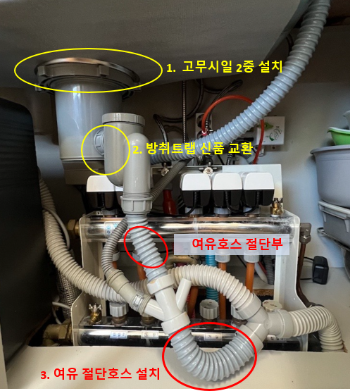 교체를 하고 나면 아래와 같습니다. 누수가 잘 발생하는 부위를 표시하였습니다.