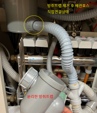 3. 교환제품 오기 전까지 임시조치 필요시, 방취트랩을 제거하고 배수호스를 바로 연결해서 사용합니다.